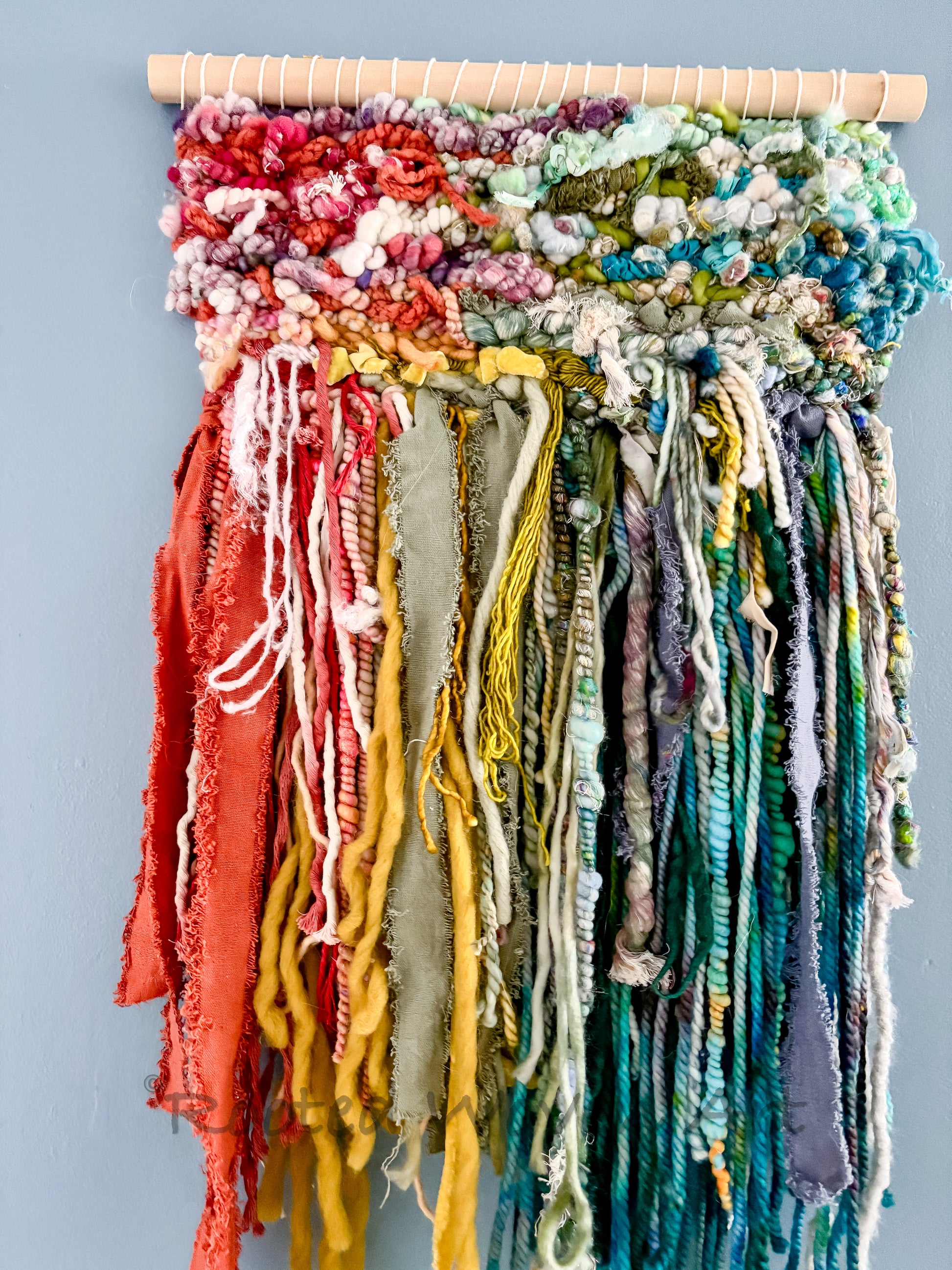 hand dyed hand spun yarn, recycled bits, woven by me in my studio